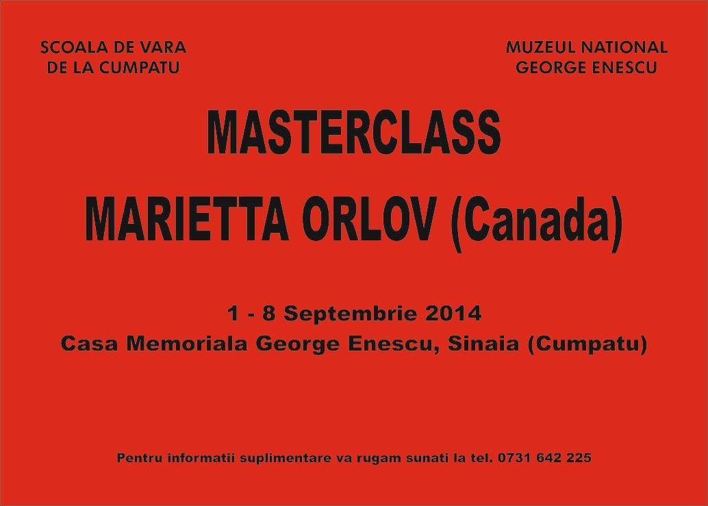 - Masterclass in colaborare cu renumita profesoara, doamna MARIETTA ORLOV (Conservatorul din Toronto) in colaborare cu CASA MEMORIALA "George Enescu" (Vila "luminis") de la Sinaia (2013).